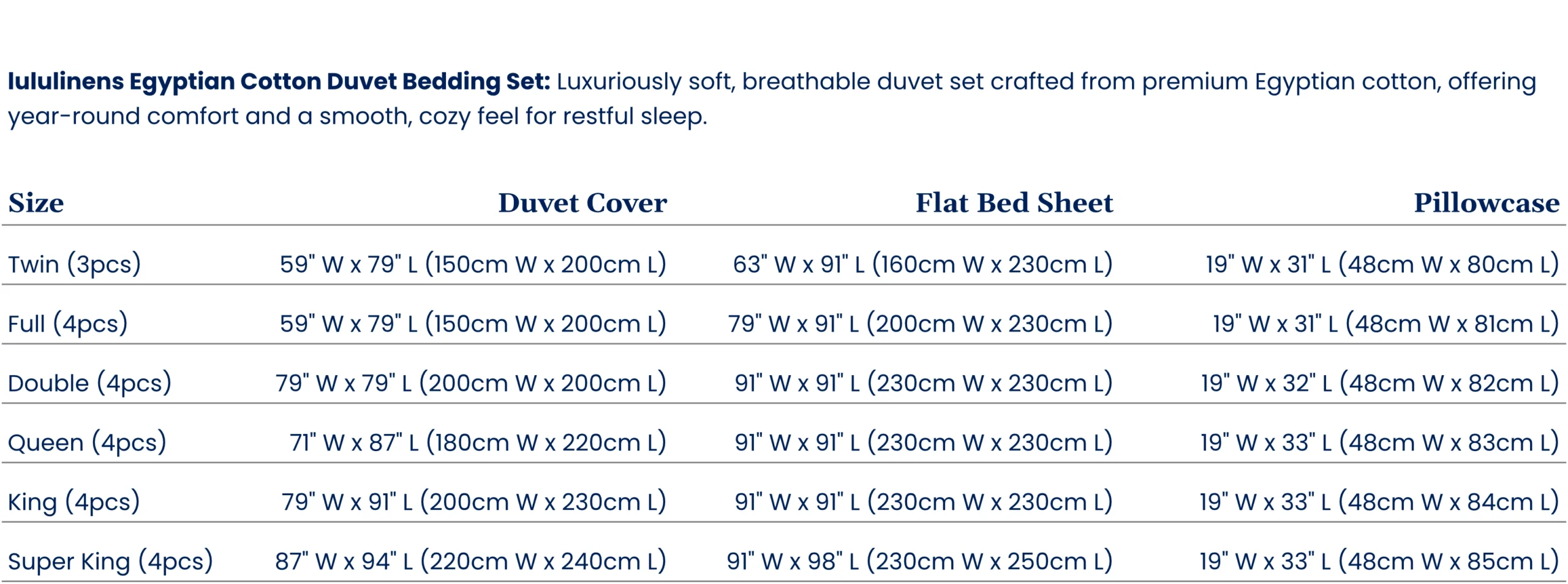Egyptian Cotton Duvet Bedding Set Size Guide